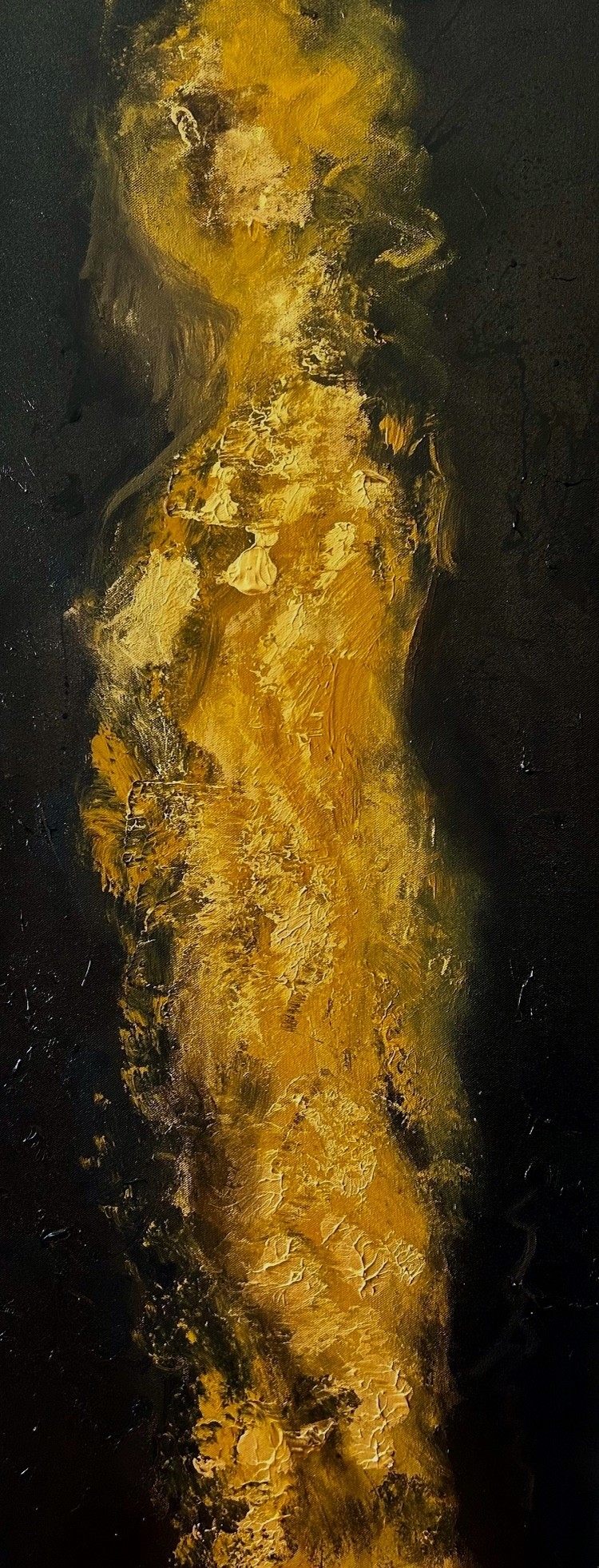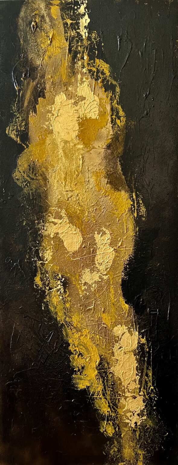 Artiste américaine originaire de Chicago et installée aujourd’hui à Limoges, Yasmin Bussiere puise son inspiration dans un parcours de vie tissé de voyages, de bouleversements culturels et de rencontres aux quatre coins du monde. Des récits familiaux marqués par l’Europe à l’Asie, à ses séjours en Asie Centrale, en Afrique de l’Ouest, en Chine, au Moyen Orient, et en Europe Orientale, elle façonne une œuvre où se mêlent souvenirs, mythes et paysages lointains. Autodidacte en peinture, diplômée en architecture d’intérieur, elle développe un style abstrait et textural, riche en matières et en symboles. Sa technique associe acrylique, encres, stylos métalliques, feuilles d’or et d’argent, pastels à l’huile et pâte de texture, créant des compositions aux reflets changeants. Ses pièces évoquent tour à tour des silhouettes humaines ou animales, des fragments de calligraphie arabe ou des atmosphères inspirées de la Route de la Soie.